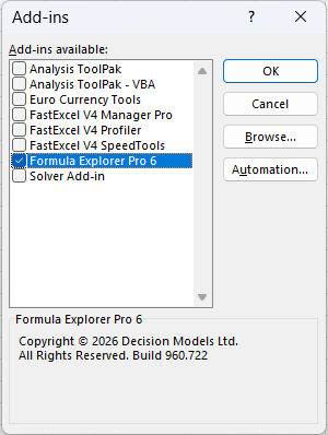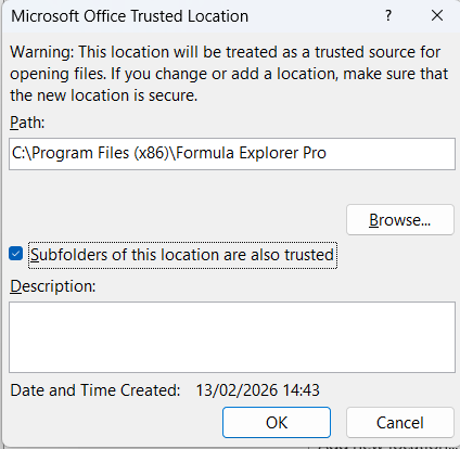 3. Make the Formula Explorer Pro folder a Trusted Location Start Excel and use File->Options->Trust Center->Trust Center Settings->Trusted Locations->Add new location->Browse to your Formula Explorer Pro folder->Check Subfolders of this Location are also trusted->OK