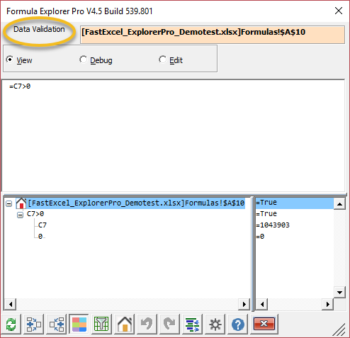 “Data Validation” is shown at the top left, and the background of the Home address box is light orange. You can use all Explorer Pro features on Data Validation formulas except Edit mode.